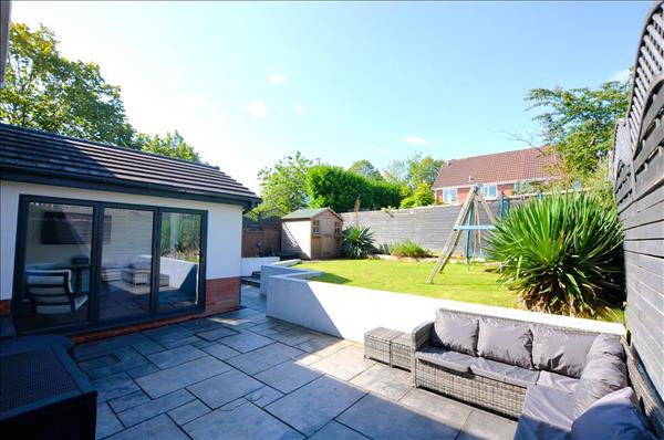 The property features a spacious resin drive to front offering parking for a number of vehicles. Gated access at side leading down an Indian stone walkway and Indian stone patio area. Steps up to further Indian stone patio, lawn and sleeper border beds. Enclosed by wooden fencing.